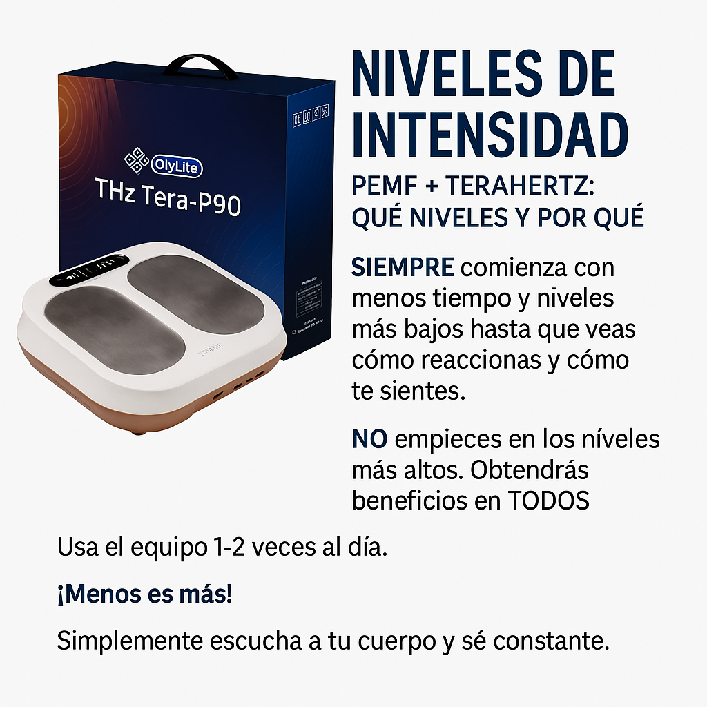 “El Tera P90 combina campos electromagnéticos pulsados (PEMF) con luz de terahercios, un tipo de infrarrojo lejano de 8‑15 µm, que penetra 4‑5 cm y activa la energía celular.”